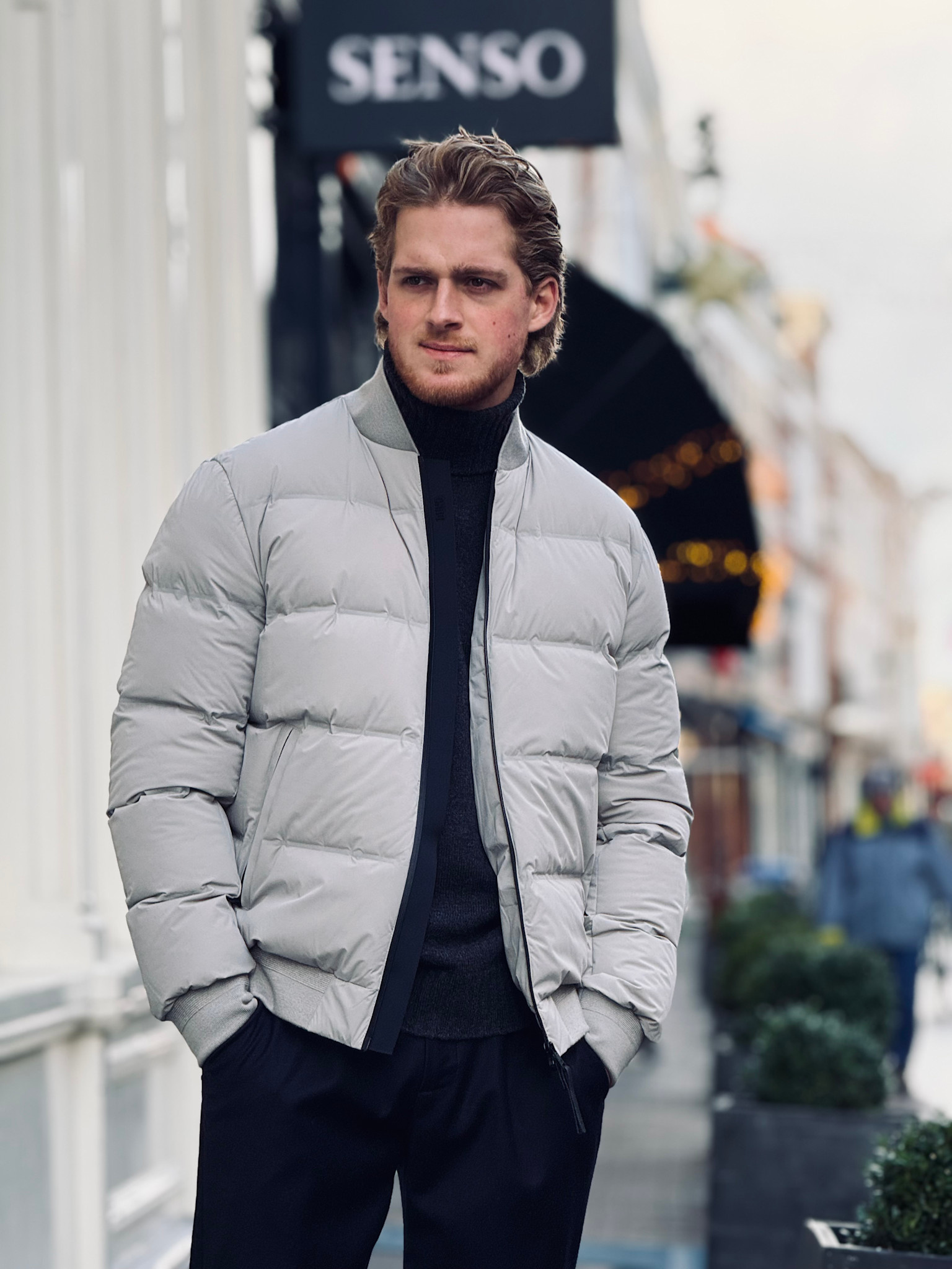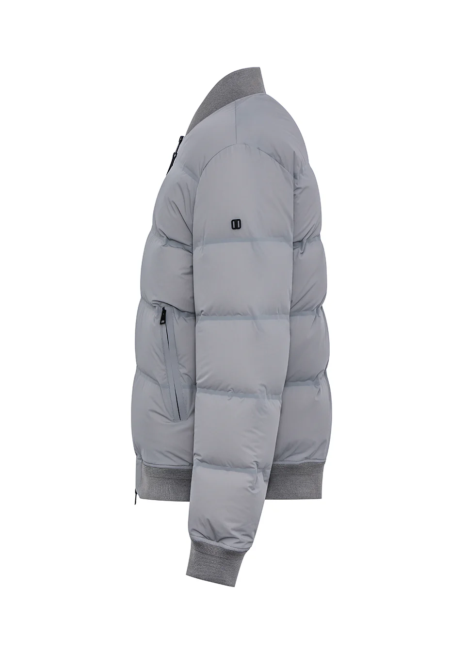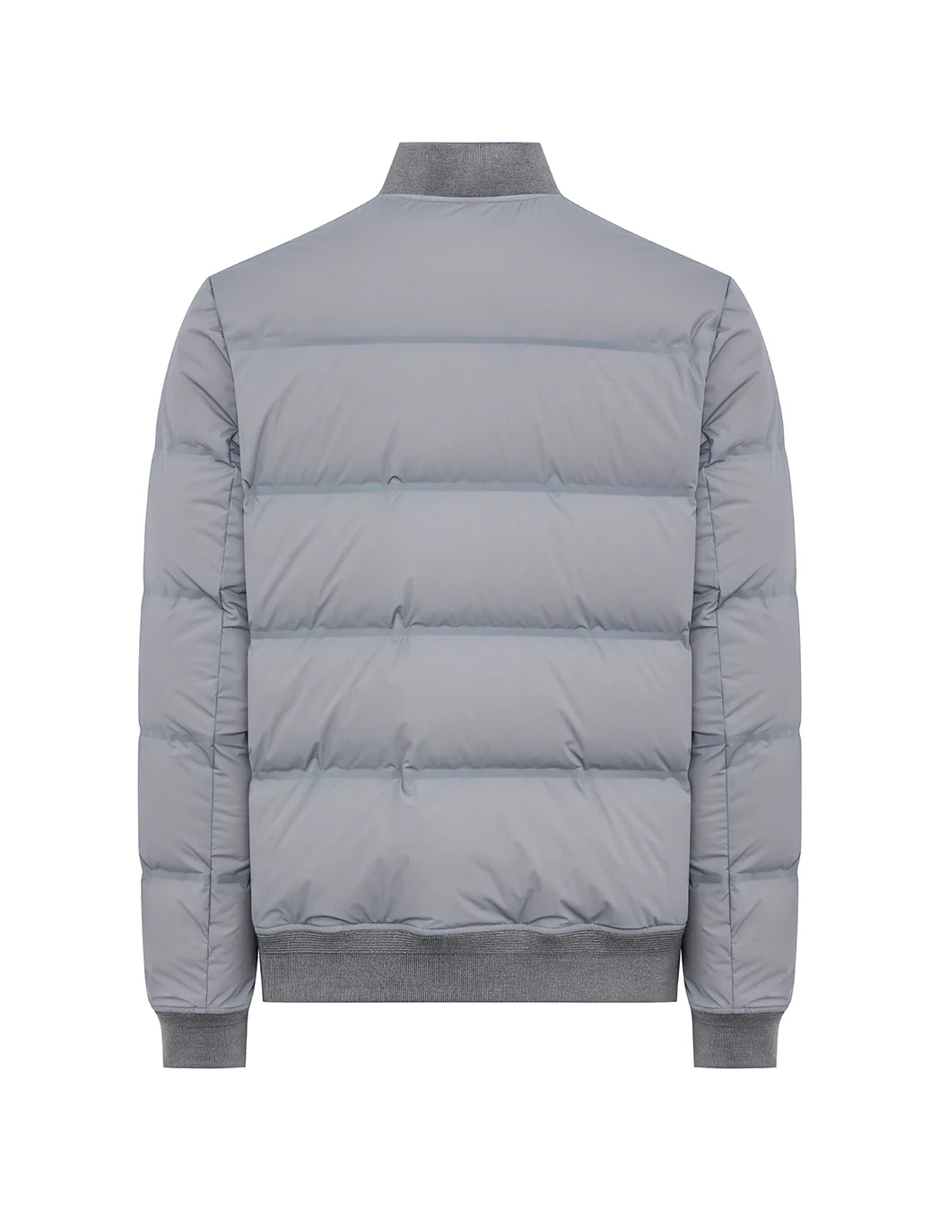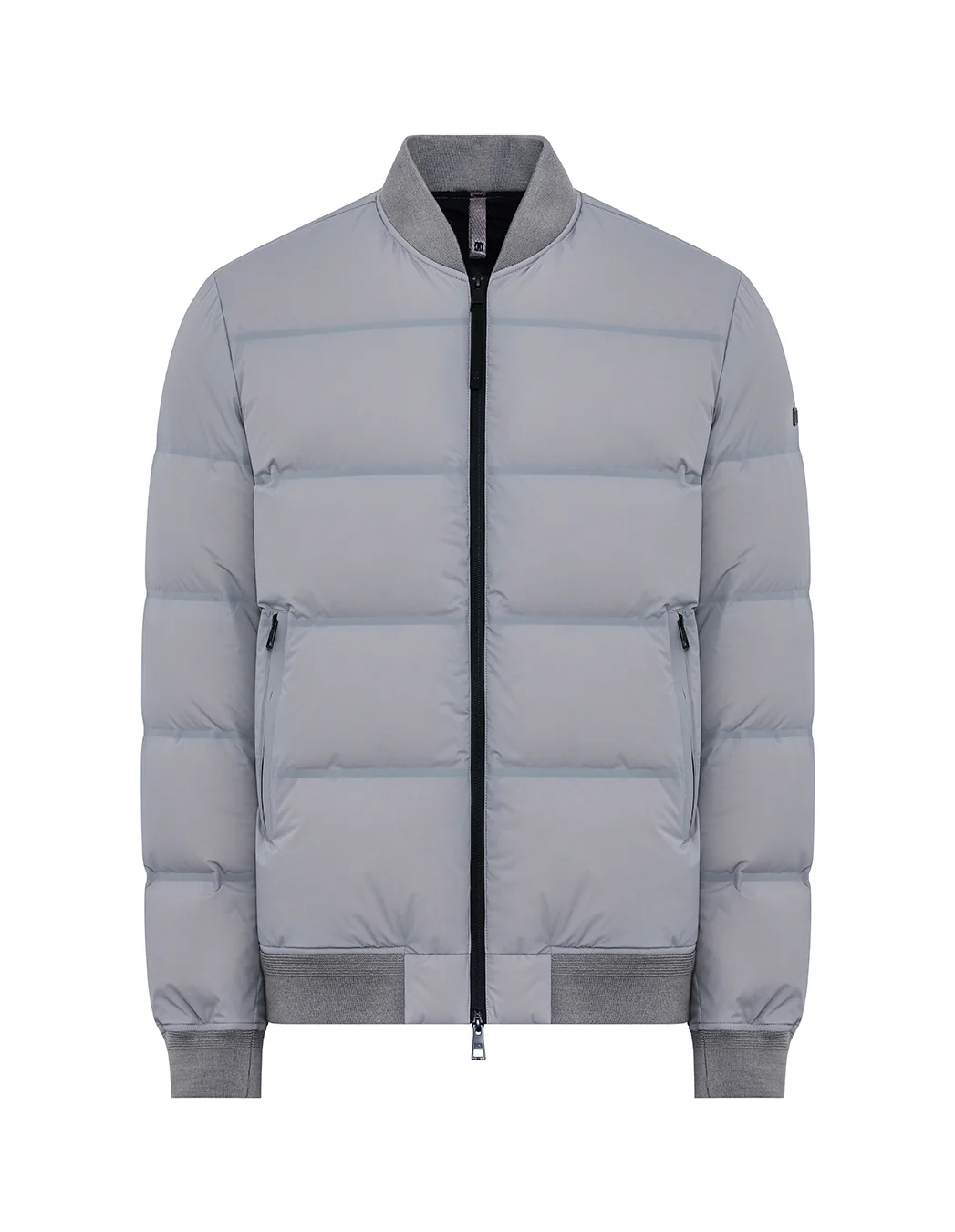 Padded bomber down jacket in bi-stretch superlight technical fabric with wool knit trims on the collar, cuffs and bottom. Heatsealed details for the direct feather filling process, without using any seams. Front closure and slant side pockets with water-resistant zipper and black neoprene under-zip detail with embossed logo. lnside, multi-functional pockets and reflective details.